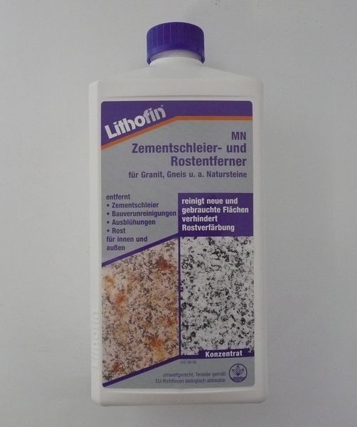 Speciální prostředek, který rozpouští a odstraňuje cementové závoje, výkvěty, usazeniny vápna, ztvrdlé zbytky rzi a zabarvení rzí. Použití na nově položené i již používané plochy. Přípravek není vhodný na broušené a leštěné povrchy z vápence, mramoru, teraca a podobných ploch citlivých na kyseliny. Po ošetření doporučujeme použít impregnační prostředek Lithofin Grundschutz W.